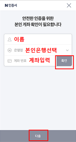 3. 본인계좌확인을 통해 본인인증을 합니다.