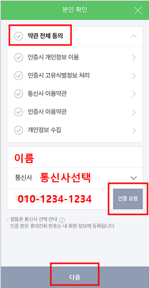 2. 본인확인 약관동의하고, 통신사 인증을 합니다.
