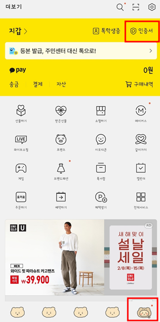 카카오톡 간편인증서간편 인증서 발급 방법에 대해 알아보겠습니다. 카카오톡 간편 인증서는 카카오톡을 실행하신 후 이용하실 수 있습니다.