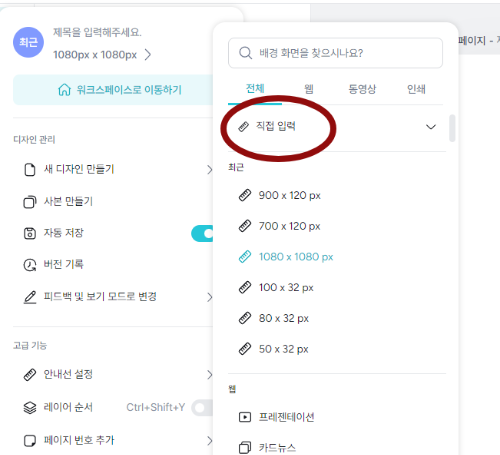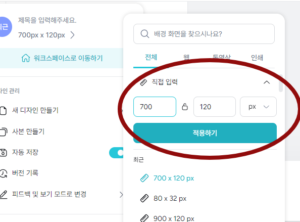 1080x1080 되어있는 부분을 누르고 > 직접입력 > 700x120 설정해 줍니다.