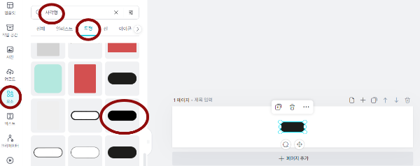 왼쪽 '요소'선택 > 위에 '돋보기' 모양에서 '사각형' 입력> 도형 선택 > 원하는 도형선택 저는 '테투리 라인이 없는 깔끔한 원형'을 선택했습니다. 사이즈를 원하는 사이즈로 늘려줍니다.