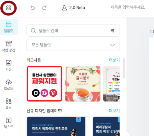 먼저 제일 왼쪽 위 네모를 누르시면 제작 사이즈를 정할 수 있습니다.