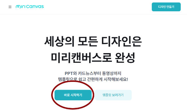 먼저 아래 버튼을 통해 미리캔버스 홈페이지로 가셔서 회원가입 후, 사용할 준비를 합니다. 회원가입을 하시면 내가 작업한 작업을 저장할 수 있어, 다음에 다시 불러와서 쉽게 작업할 수 있습니다.