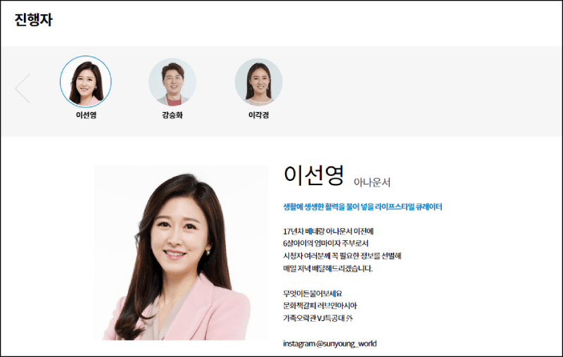 2TV 생생정보의 진행자분들은 이선영 아나운서, 강승화 아나운서, 이각경 아나운서입니다. 생생정보 프로그램은 우리에게 다양한 정보와 유익한 소식을 전달해 주는 프로그램입니다. 아나운서분들의 명쾌한 설명은 우리의 이해를 돕고, 전문적인 진행으로 시청자들이 즐겁고 유익한 정보를 받을 수 있도록 도와줍니다. 생생정보에서 소개하는 진행자분들 어떤 분들인지 지금 바로 확인해 보세요.