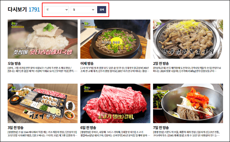 2TV생생정보 최근 방송은 생생정보 메인홈페이지에서도 바로 보실 수 있습니다. 또한 다시 보기 페이지에서도 보실 수 있습니다. 지난 모든 방송을 다 볼 수 있기 때문에 혹시라도 방송을 놓치셨거나 다시 보고 싶으신 분들은 언제든지 다시 시청하실 수 있습니다. 최근 방송은 앞부분에 바로 나오기 때문에 어렵지 않게 시청하실 수 있습니다. 조금 오래된 방송일 경우 연도와 월을 검색하셔서 시청하실 수 있습니다.