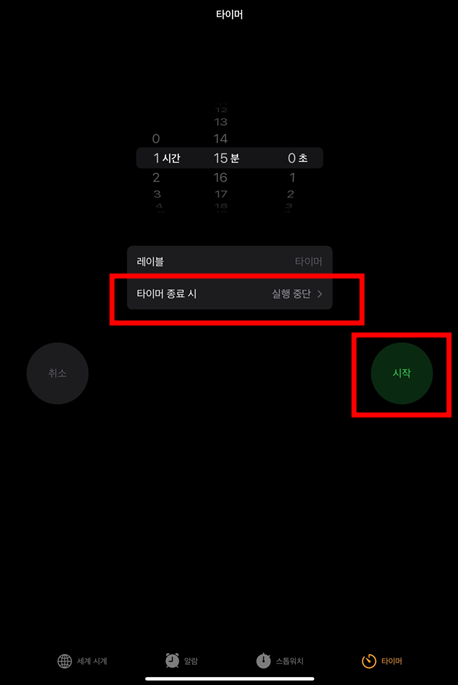 그럼 아래 메뉴에 세계시계, 알람, 스톱워치, 타이머가 있는데요. 여기서 타이머를 선택합니다. 그다음 몇 분 후, 몇 시간 후 앱이 종료되면 좋을지 시간을 설정합니다. 설정하는 시간에서 한 시간 후 종료되길 원하신다면 1시간 0분 0초로 설정합니다.