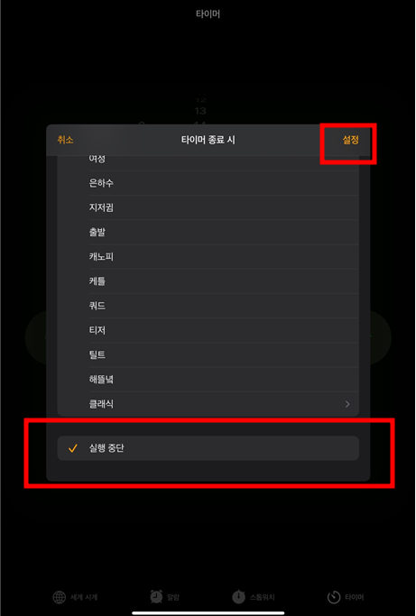 아래 타이머 종료시 원하는 동작을 선택해야 하는데요. 타이머 종료 시 > 실행중단을 선택하고 설정을 누릅니다.