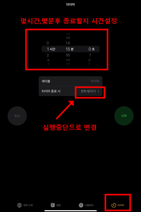 원하는 종료 시 > 타이머 종료시 실행중단 > 시작