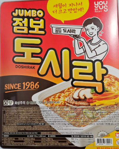 점보도시락 그림에 여성 캐릭터가 무거운지 땀을 뻘뻘 흘리고 있네요. 원래 땀을 흘리고 있는지 궁금해서 찾아봤는데, 일반 도시락 컵라면의 여성은 땀을 흘리고 있지 않습니다. 정말 재미있게 코믹요소도 넣어주었네요.