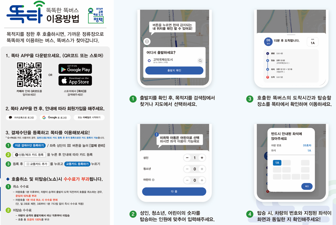 요금은 경기도 일반형 버스와 같습니다. '똑타'앱을 설치하여 호출하는 방식인데, '똑타'앱 가입 시 결제카드, 교통카드 등록을 하기 때문에, 등록된 카드가 자동 결제되는 시스템입니다.