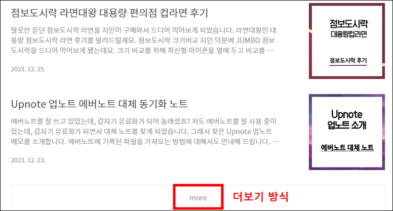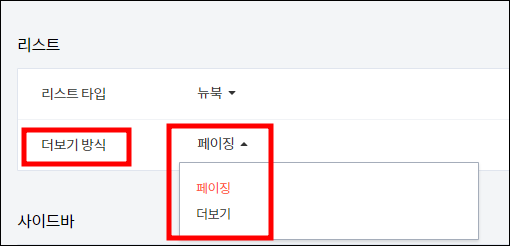 변경하는 곳은 글목록 리스트 변경하는 곳 바로 아래에 있습니다. 더보기 방식에서 선택하실 수 있습니다.