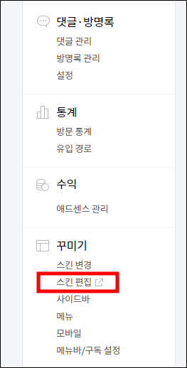 ● 꾸미기 > 스킨편집을 들어갑니다.